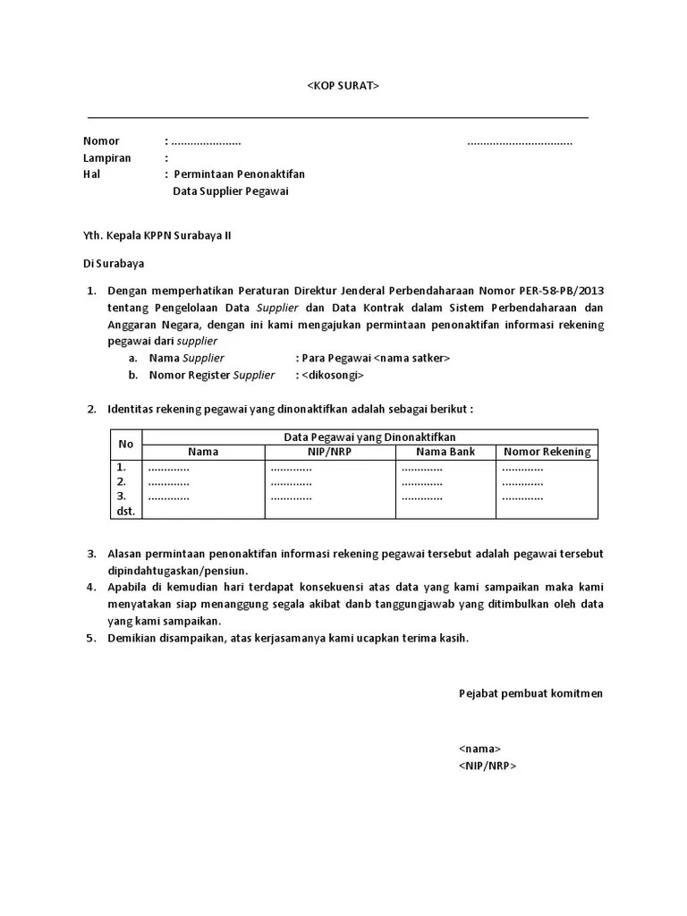 Untuk lebih jelas dan tepatnya satker koordinasikan dan bertanya langsung dengan kppn setempat wilayah satker masing2. Agar lebih mudah mengurus perpajakan, mulai dari menghitung, membayar pajak . Mohon contoh format surat permintaan blangko spt masa pasal 21. Disingkat kppn adalah instansi vertikal direktorat jenderal. Permintaan pengaktifan kembali supplier tipe 3 (pegawai) yth. Kembali aktif bekerja/dimutasikan pada satker lama sesuai dengan surat keputusan Supplier, surat pengaktifan header supplier, h. Format surat permintaan penambahan data supplier. Perbendaharaan yang memperoleh kuasa dari. 2) kode pos pada data supplier atas kontrak yang telah. Satker wajib melampirkan copy data supplier (contoh sebagaimana gambar . Contoh format surat pernyataan keterlambatan pengajuan spm, terlampir.